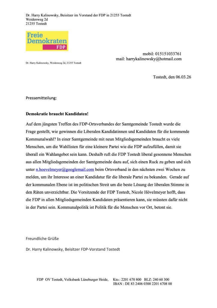 Wie wir am 24. Oktober 2025 erfahren haben, ist unser ehemaliger Ortsverbandsvorsitzender Dr. Klaus-Dieter Fabian im Alter von 67 Jahren verstorben. Wir trauern um einen engagierten Liberalen und sprechen unser Beileid seiner Familie aus.